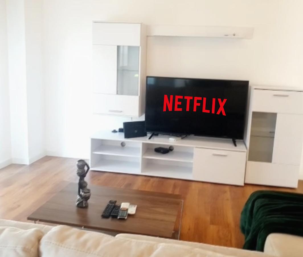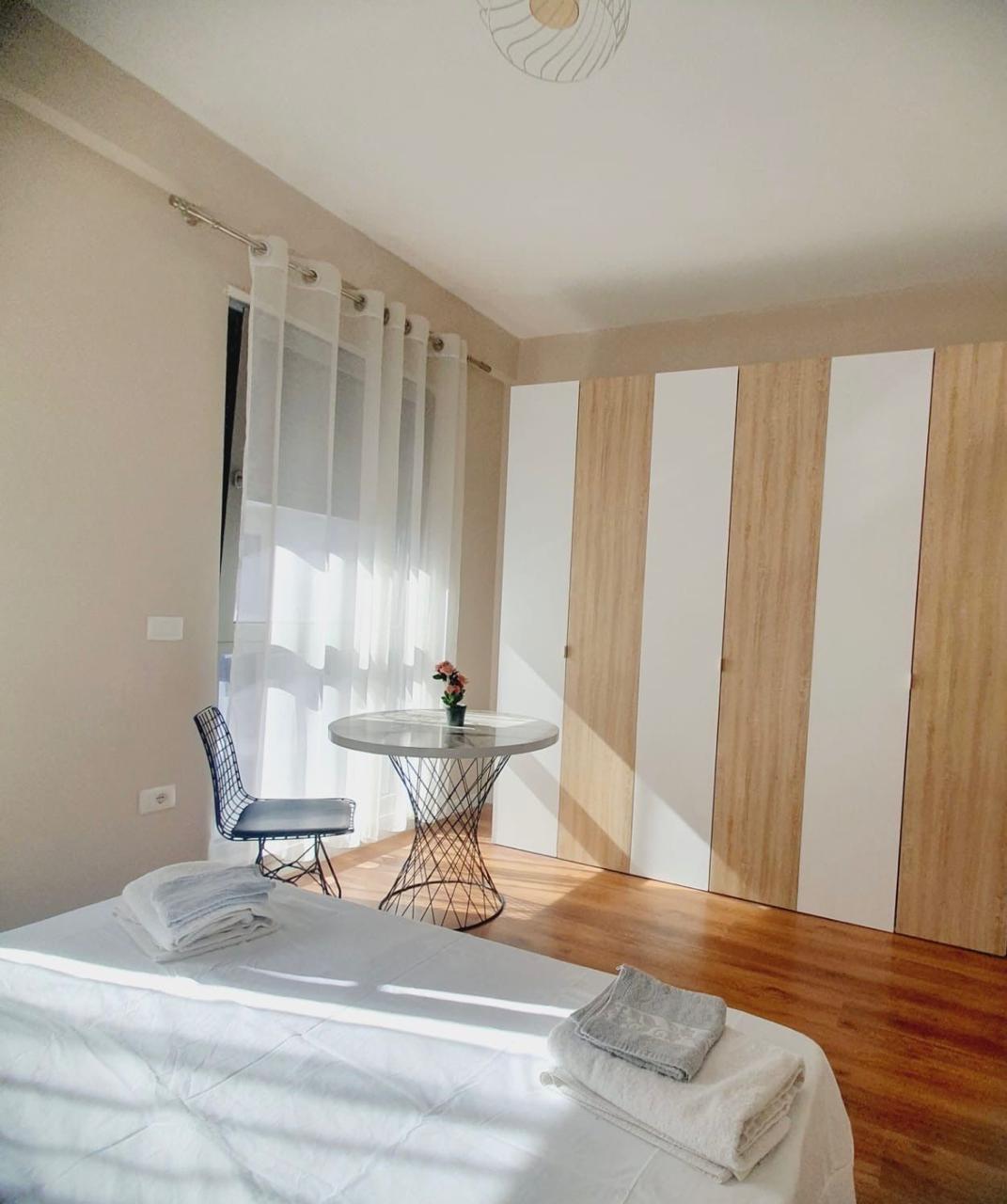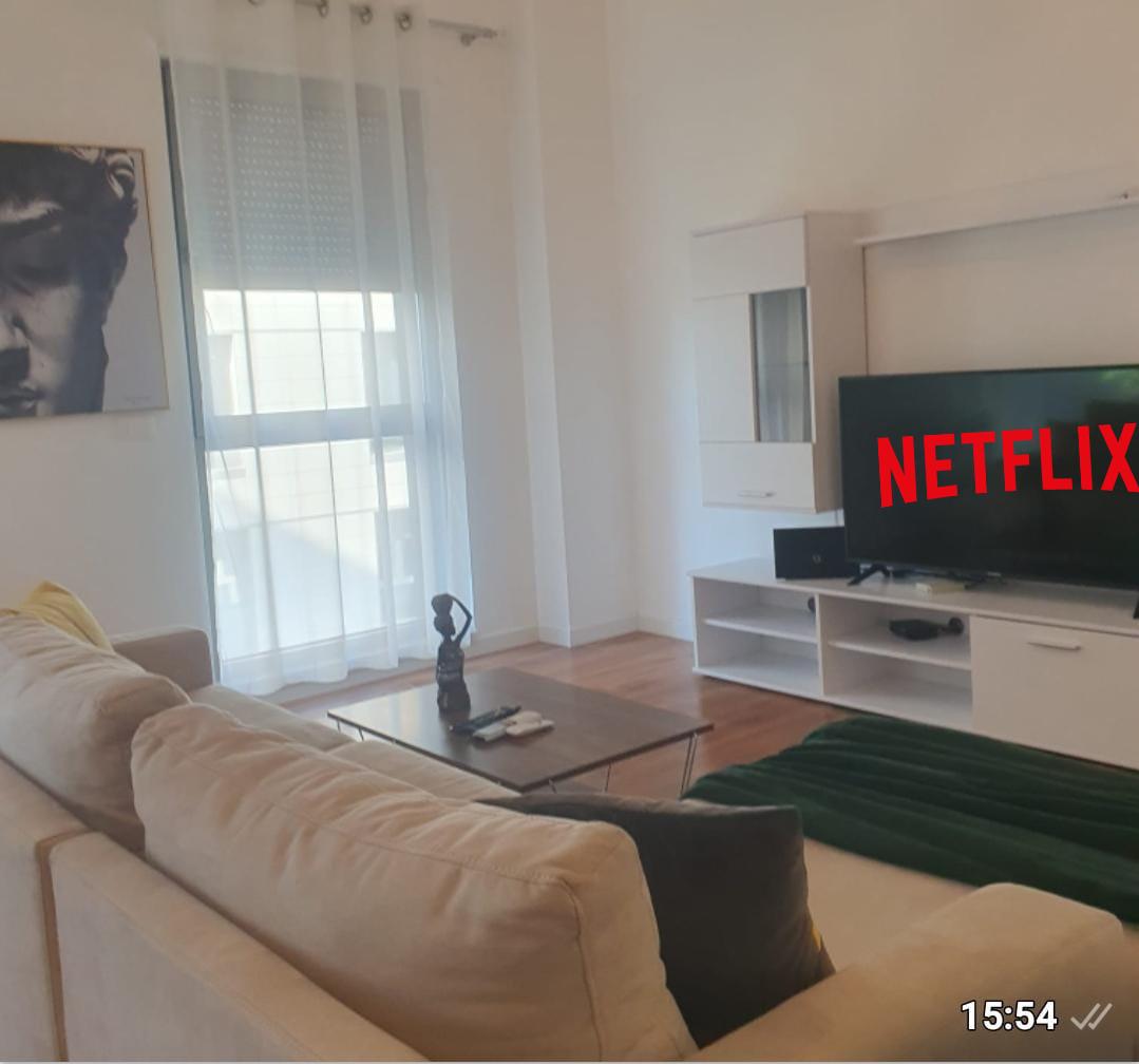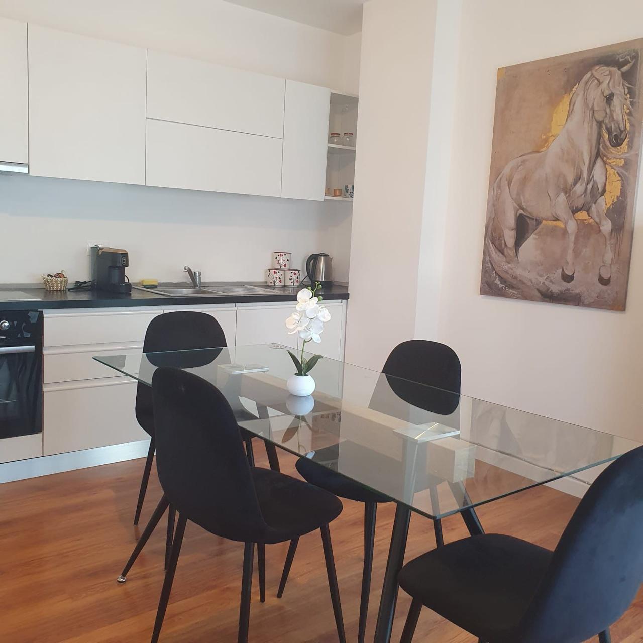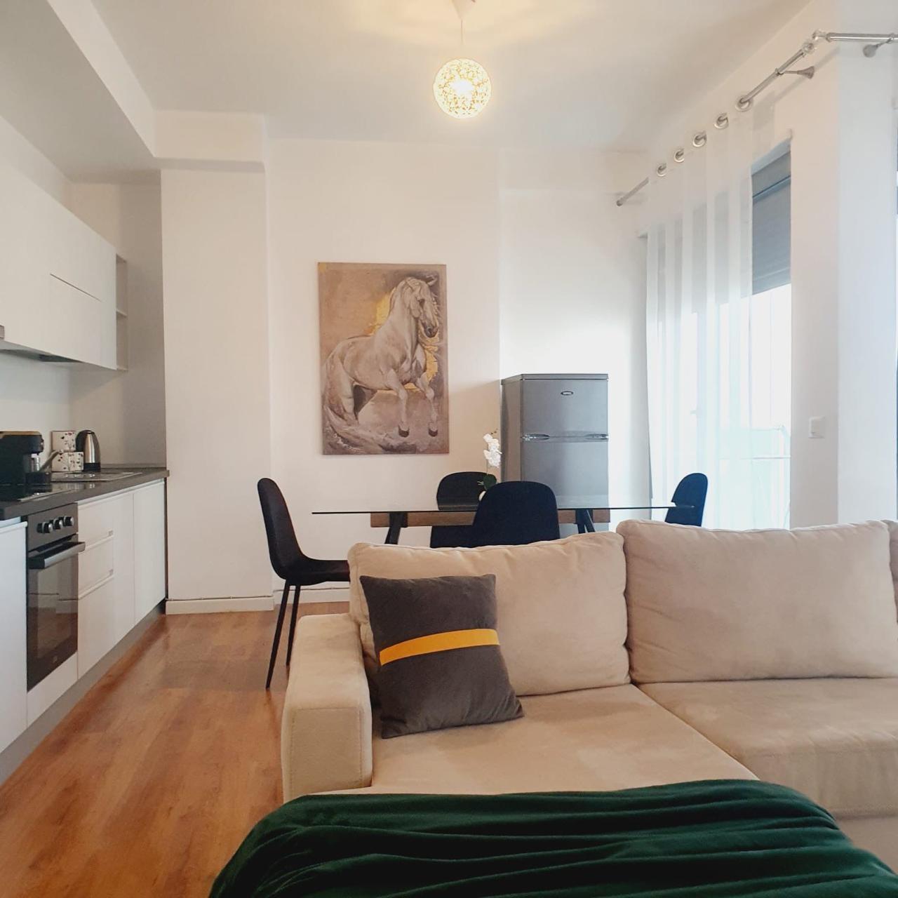 Bellissimo appartamento composto da soggiorno con cucina moderna a vista tavolo di cristallo per 4 persone , divano ad angolo grande finestra e tv a led.