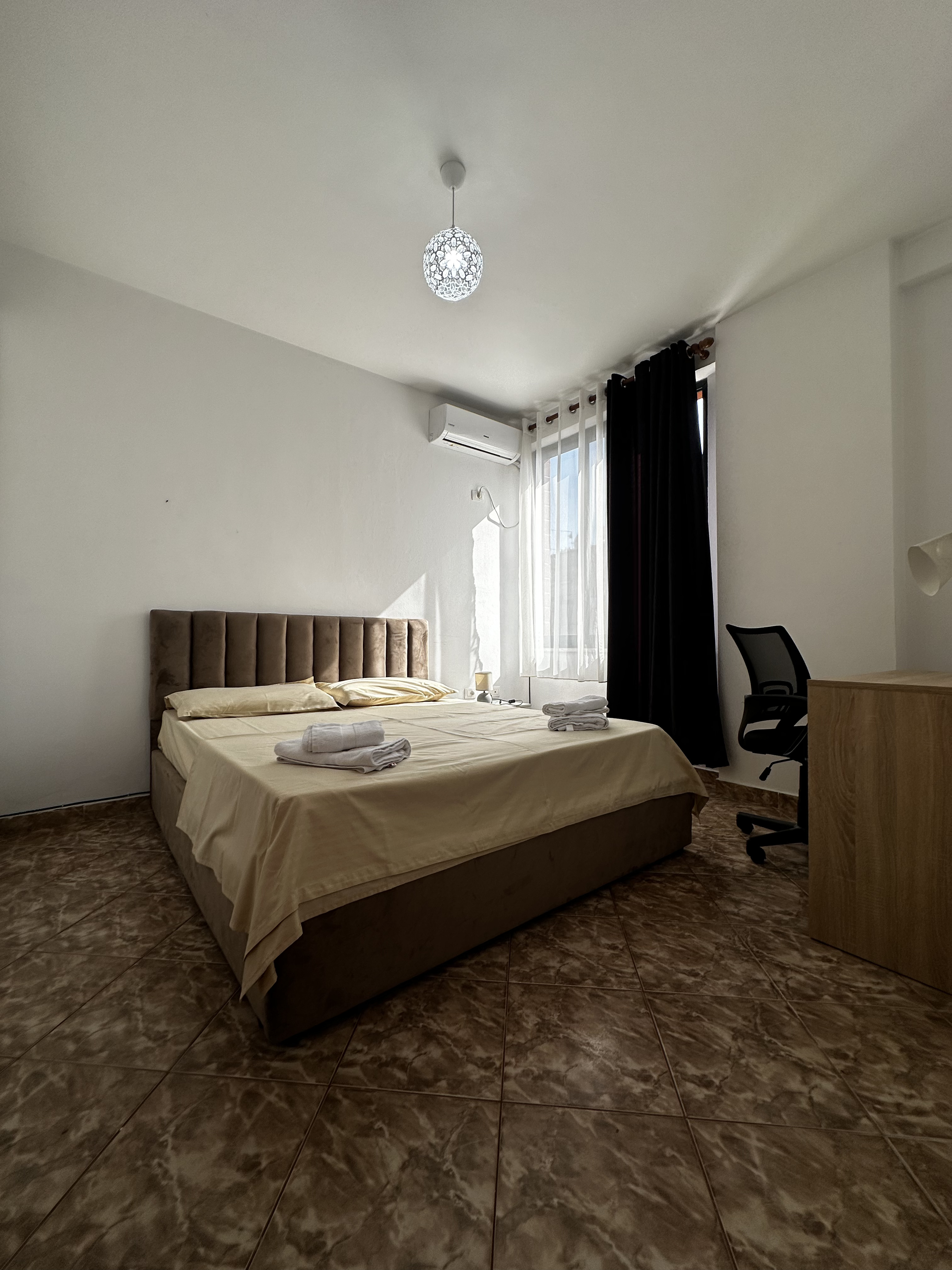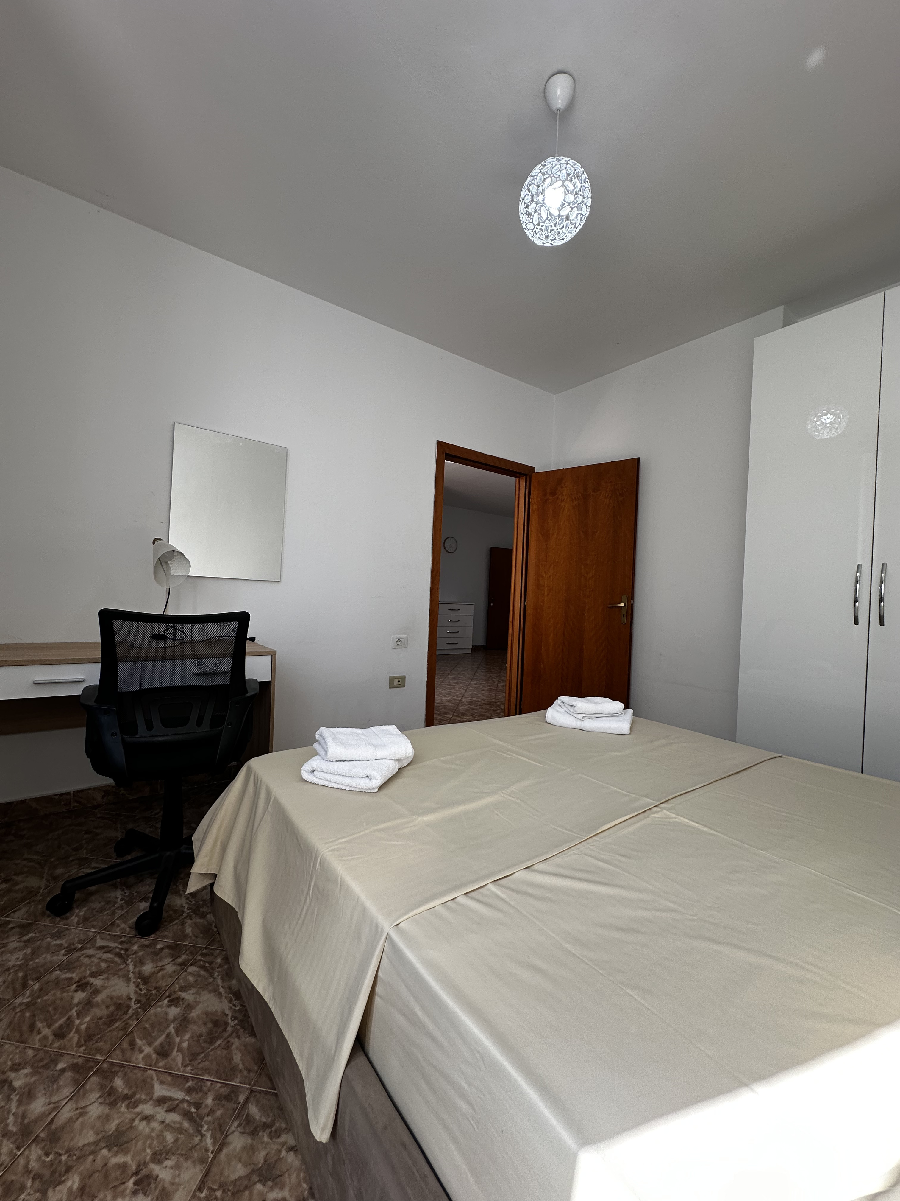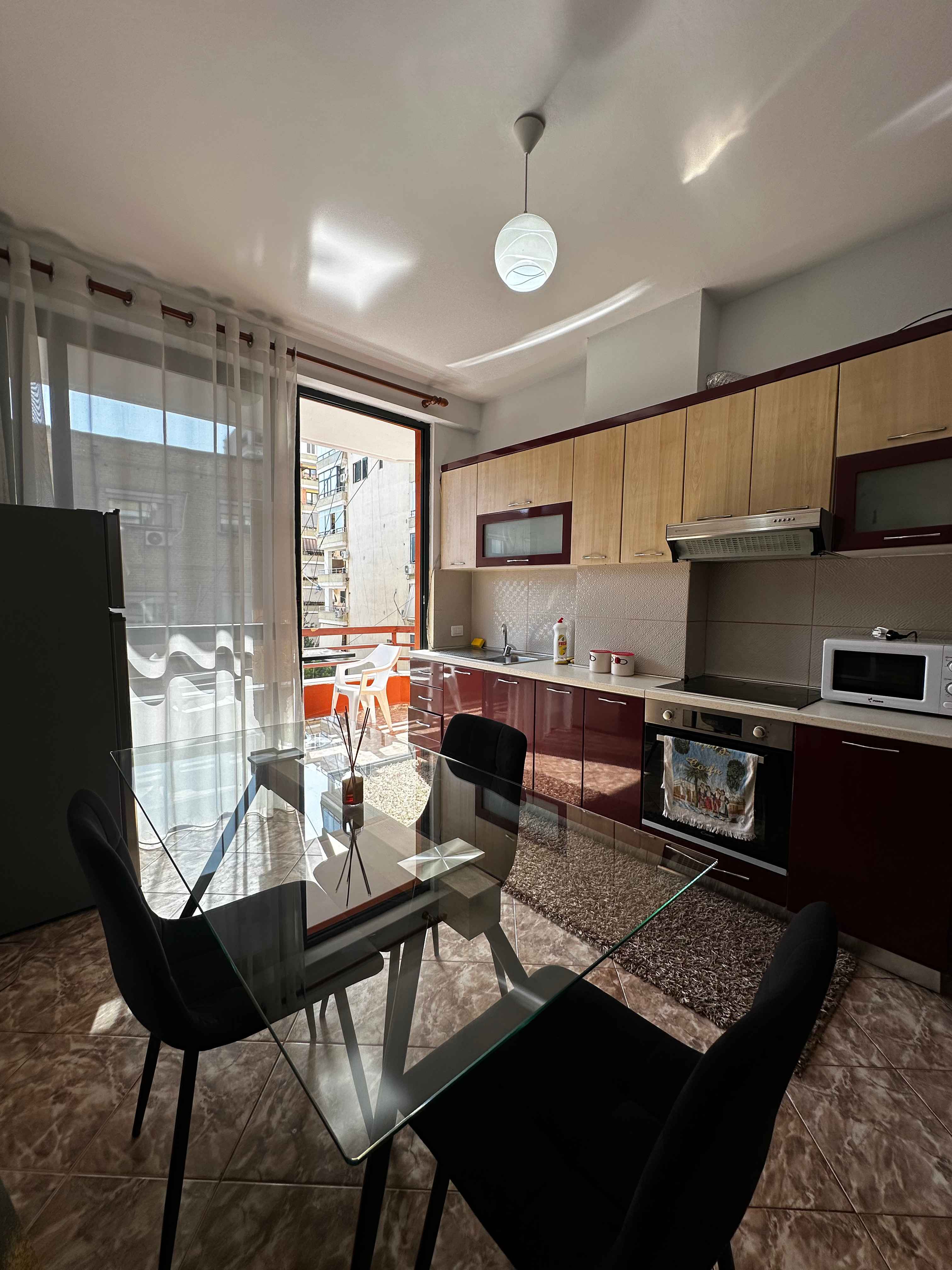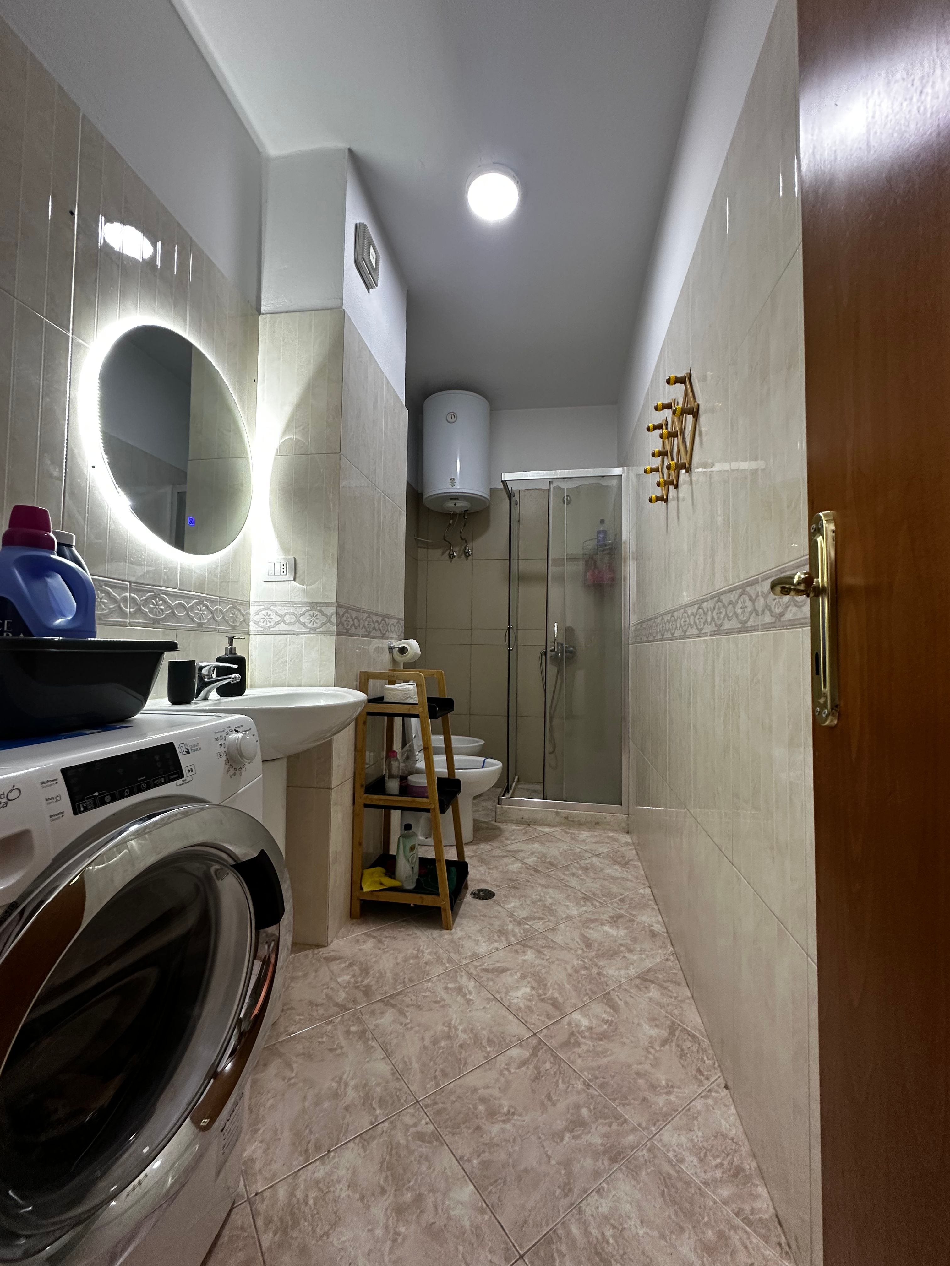 l'appartamento e composto da un ampio ingresso un ampio soggiorno con un comodo divano e tv,una cucina a vista con tutti gli elettrodomestici indispensabili, due camere da letto matrimoniali illuminate da grandi finestre e un bagno moderno con box doccia,nel soggiorno troviamo anche una portafinestra che da sul balcone.