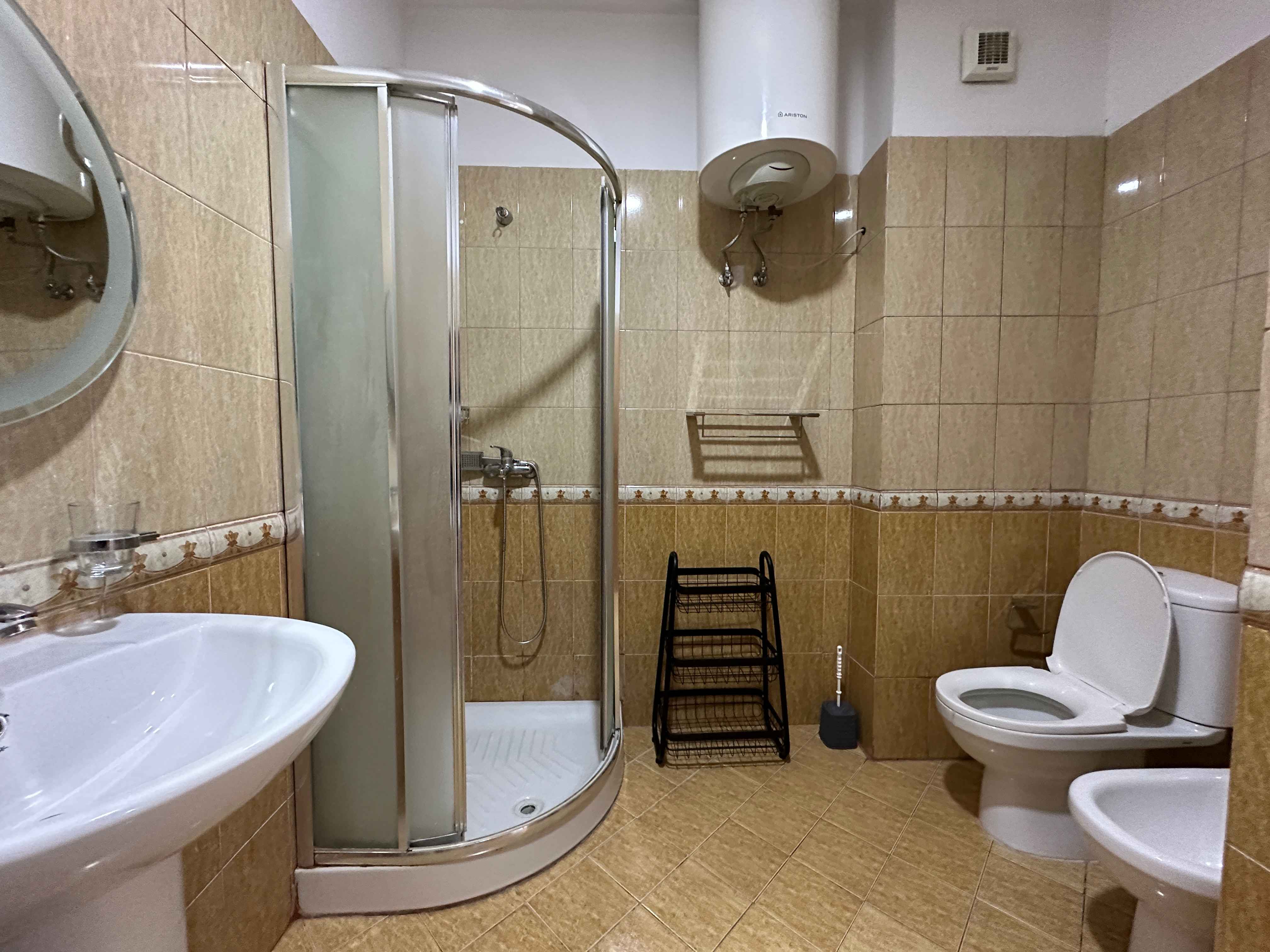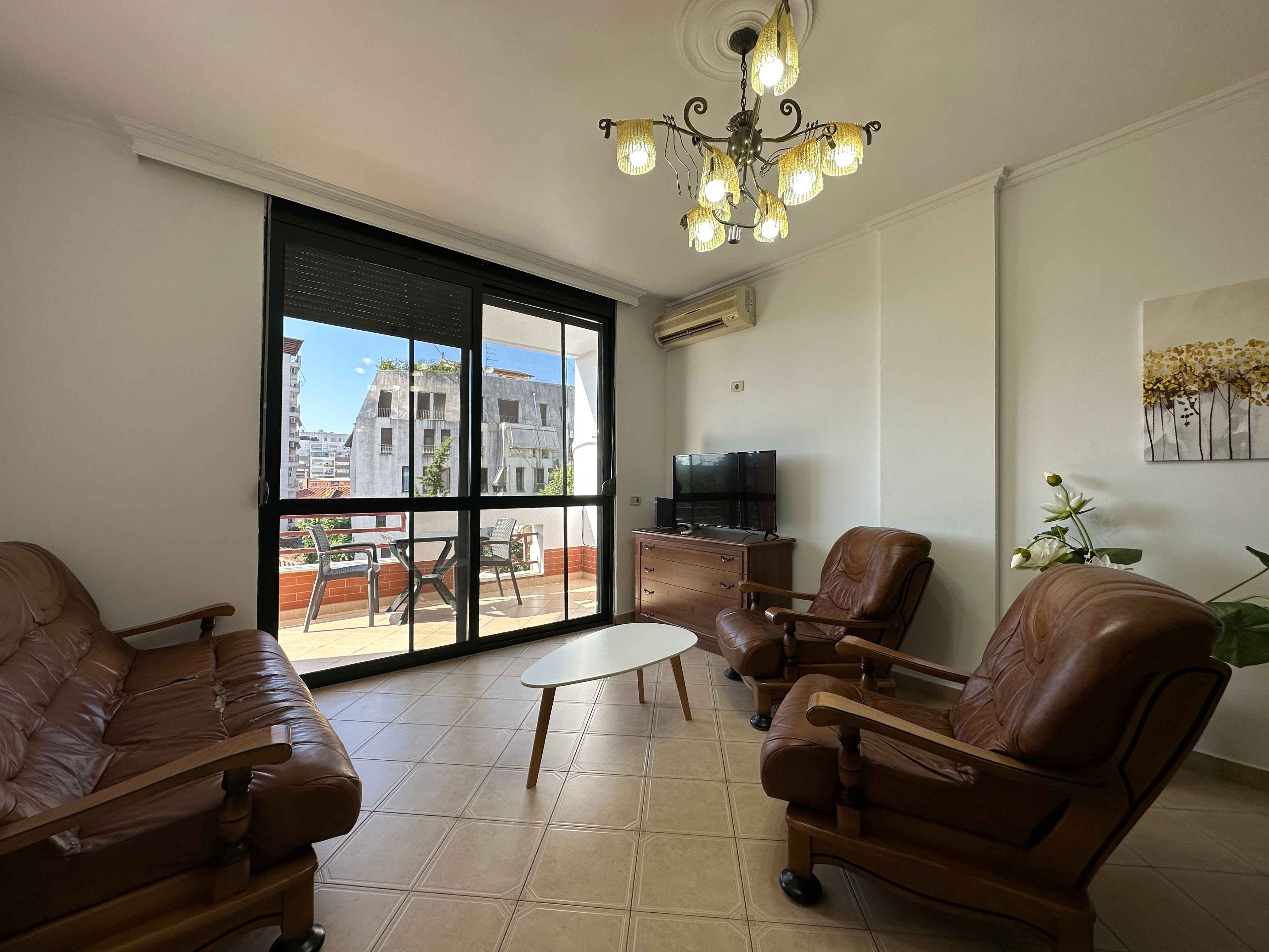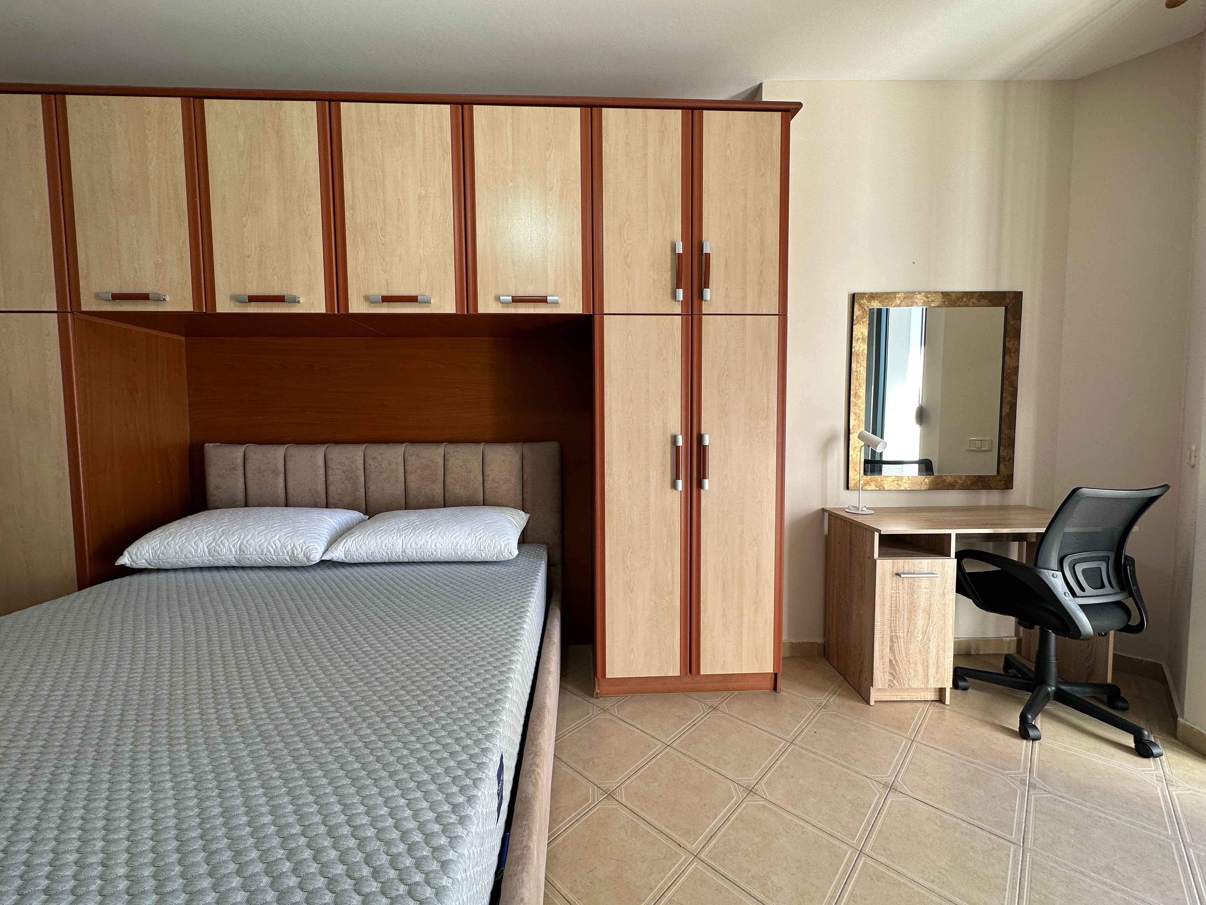 l'appartamento e composto da un ampio ingresso un ampio soggiorno con un comodo divano e tv,una cucina a vista con tutti gli elettrodomestici indispensabili, due camere da letto matrimoniali illuminate da grandi finestre e 2 bagni moderni con box doccia,nel soggiorno troviamo anche una portafinestra che da sul balcone.