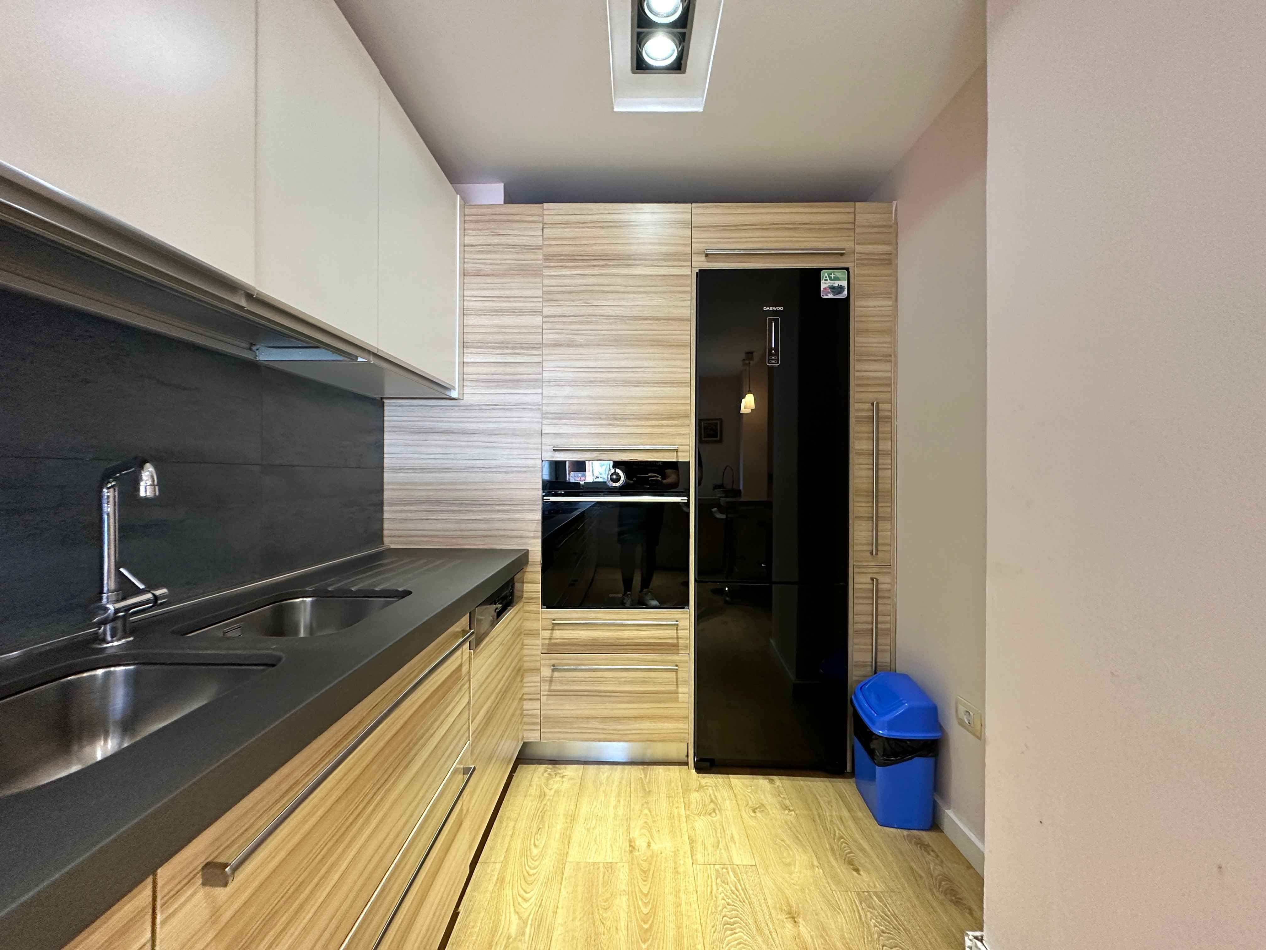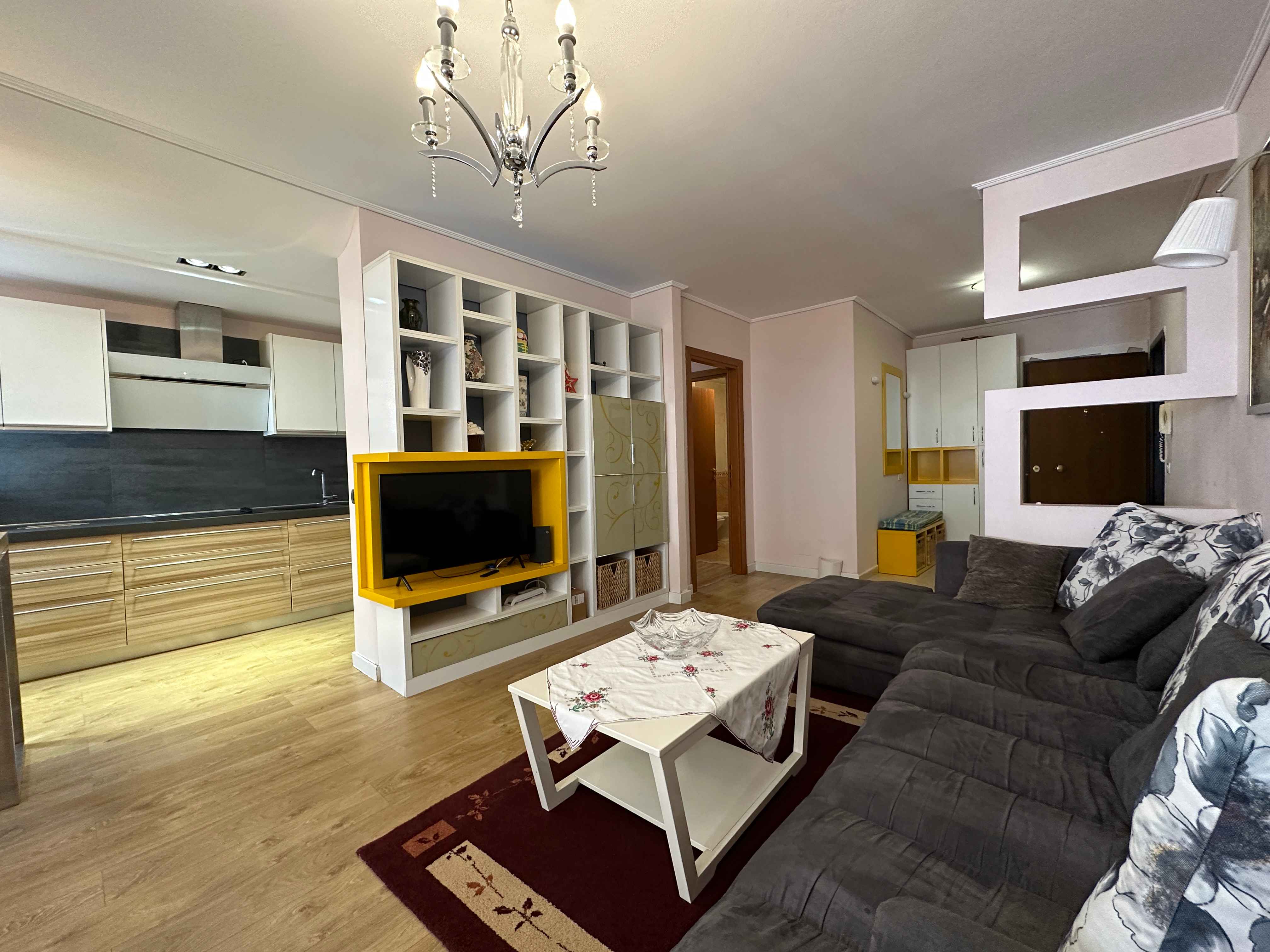 l'appartamento in stile moderno e composto da un ampio ingresso un ampio soggiorno con un comodo divano e tv,una cucina a vista con tutti gli elettrodomestici indispensabili, due camere da letto matrimoniali illuminate da grandi finestre e due bagni moderni con box doccia lavatrice,un lungo balcone con tendone.