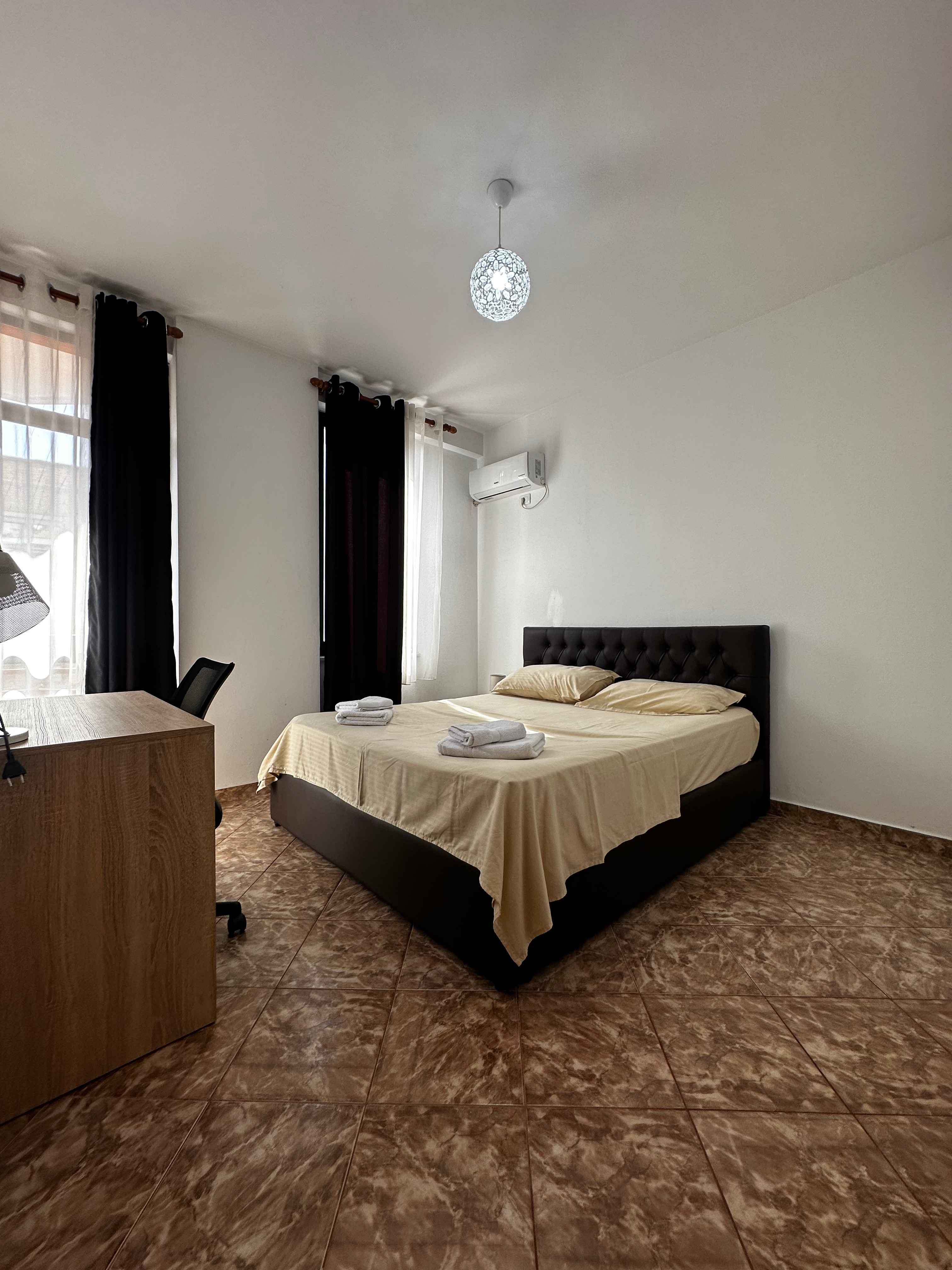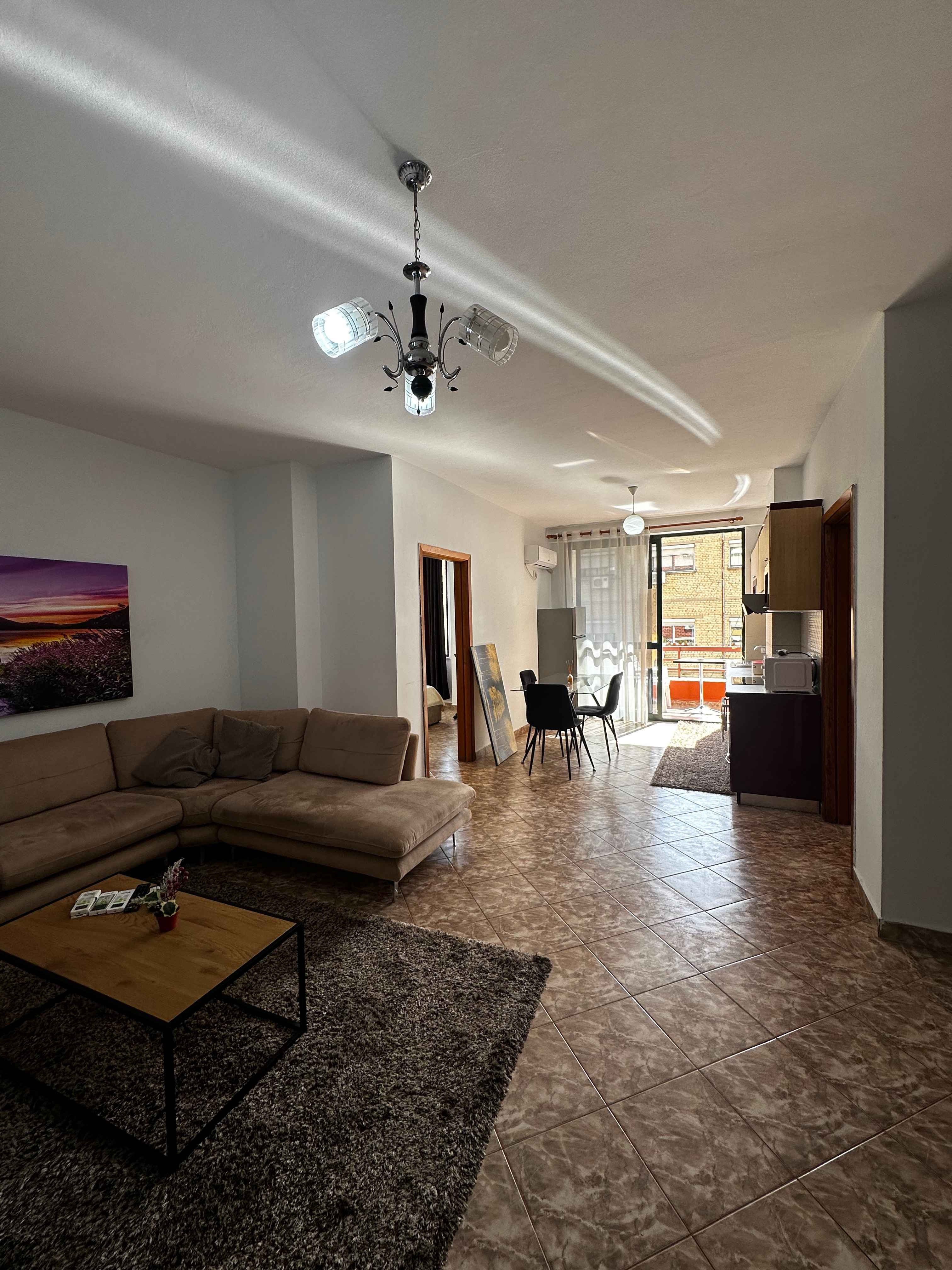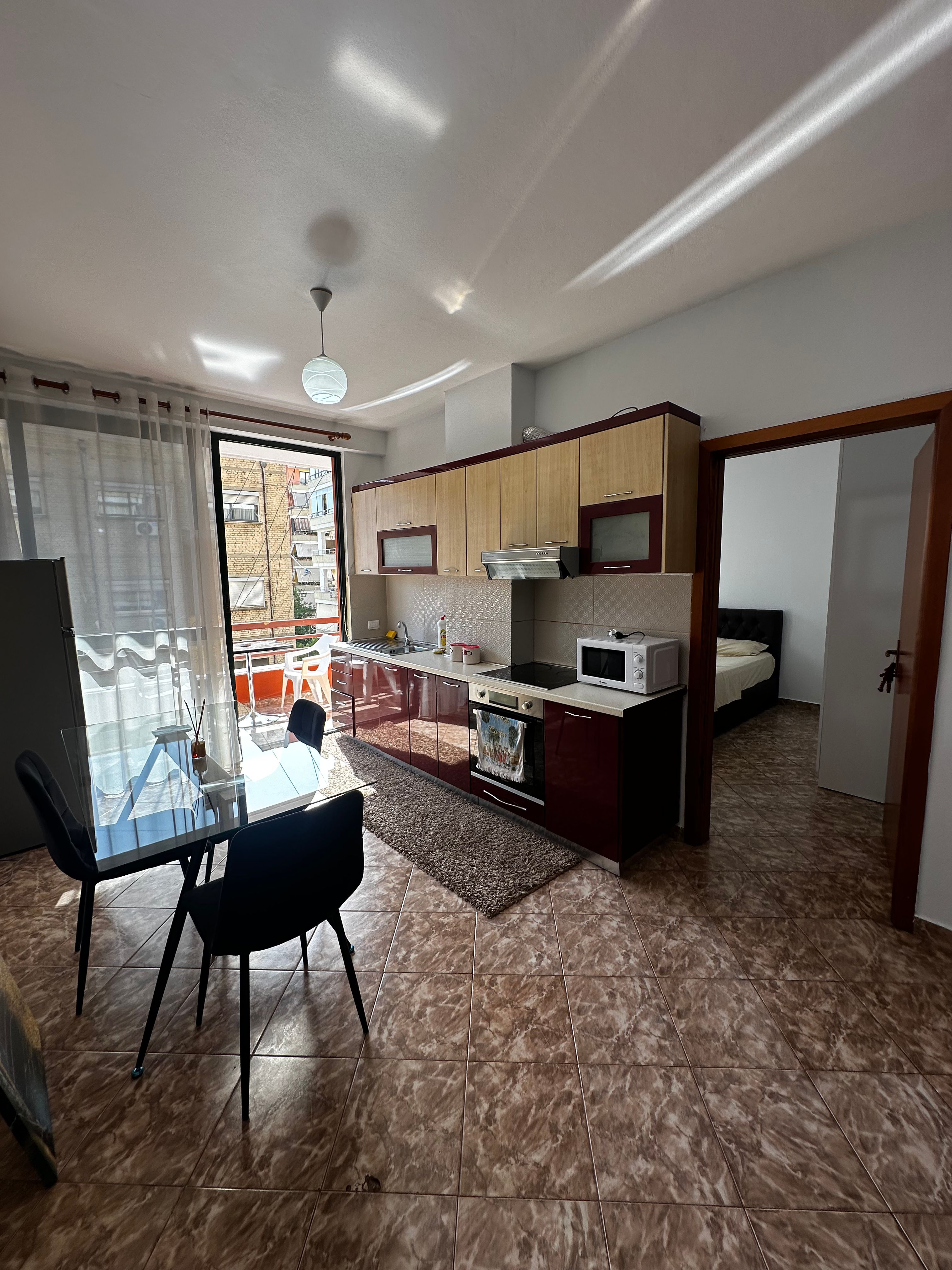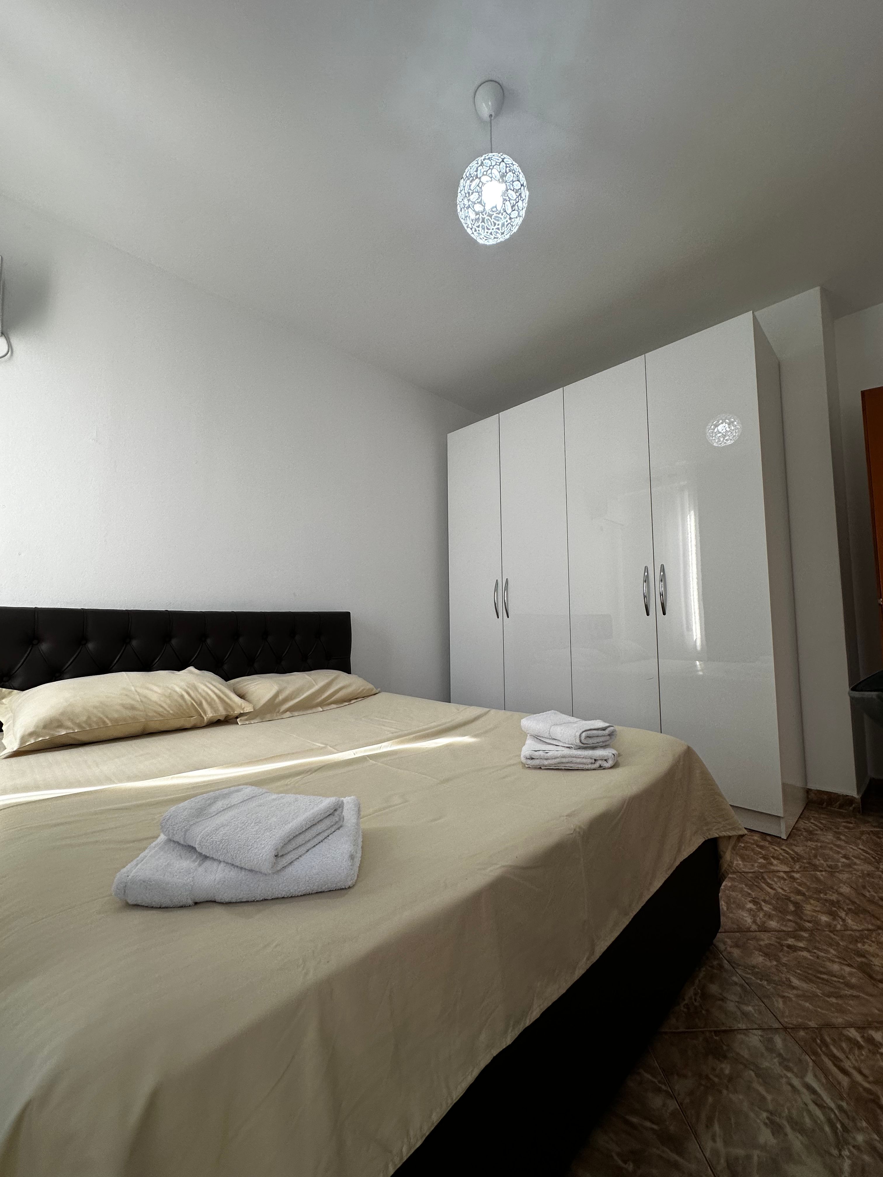 l'appartamento e composto da un ampio ingresso un ampio soggiorno con un comodo divano e tv,una cucina a vista con tutti gli elettrodomestici indispensabili, due camere da letto matrimoniali illuminate da grandi finestre e un bagno moderno con box doccia,nel soggiorno troviamo anche una portafinestra che da sul balcone.
