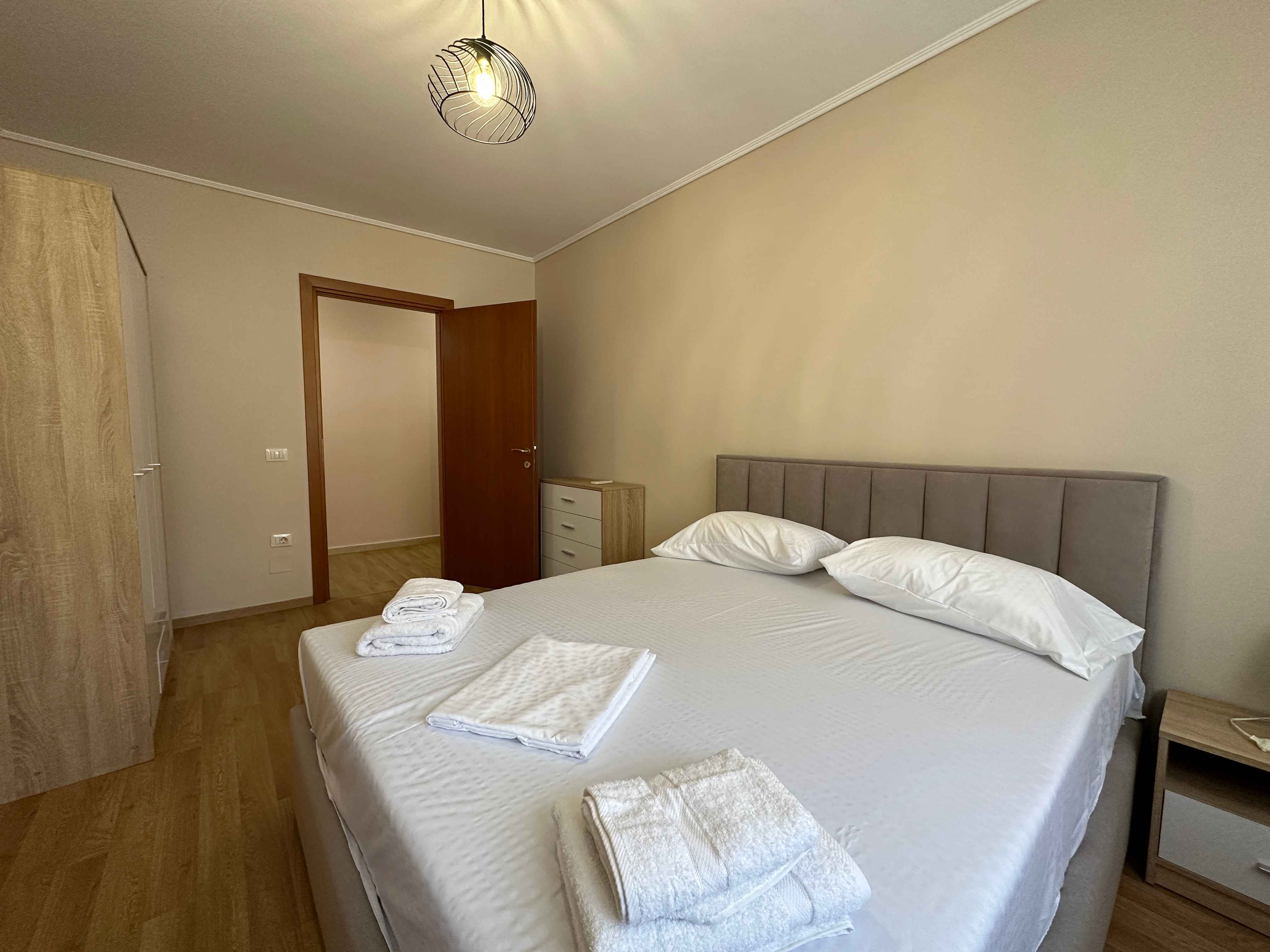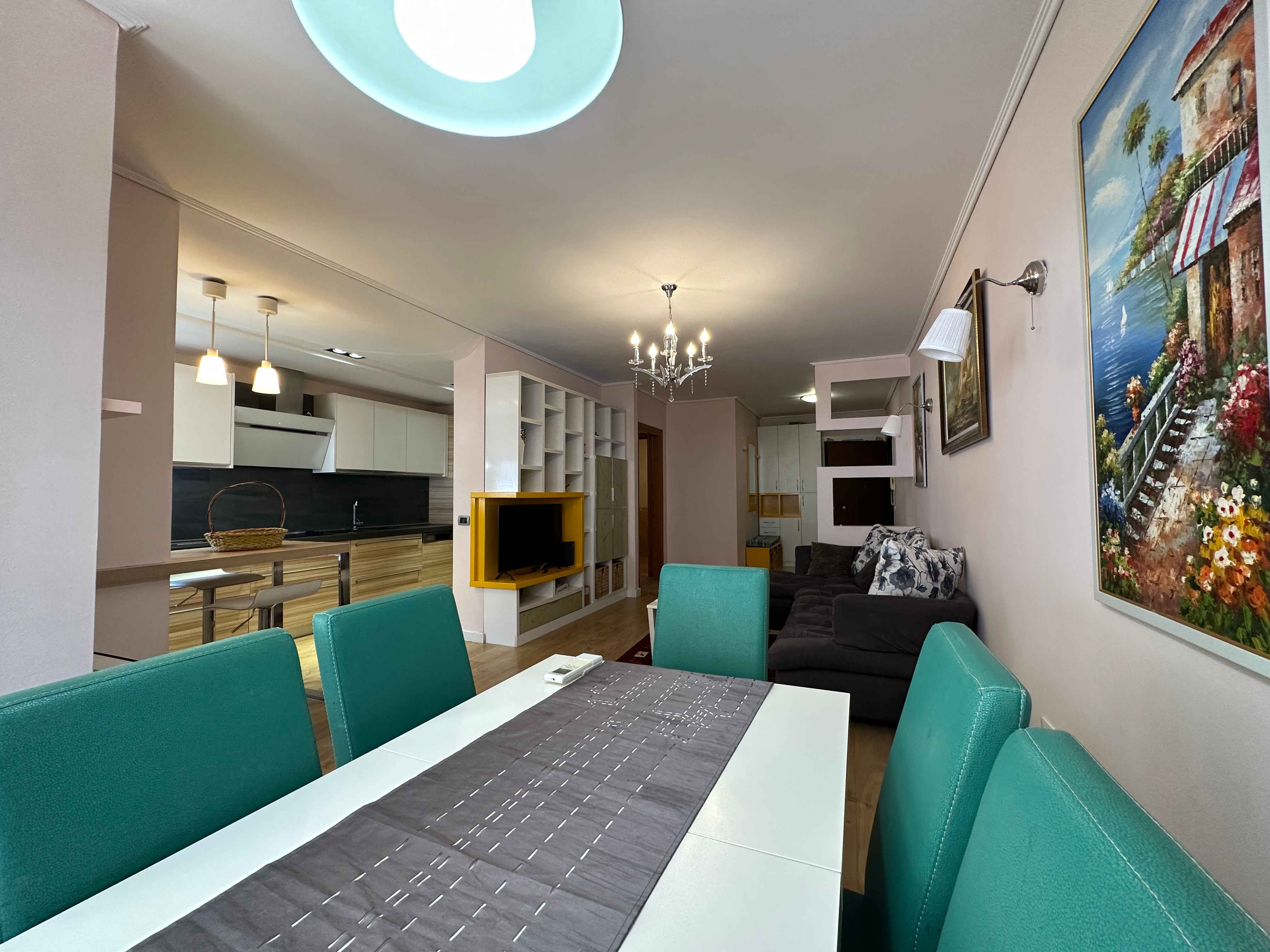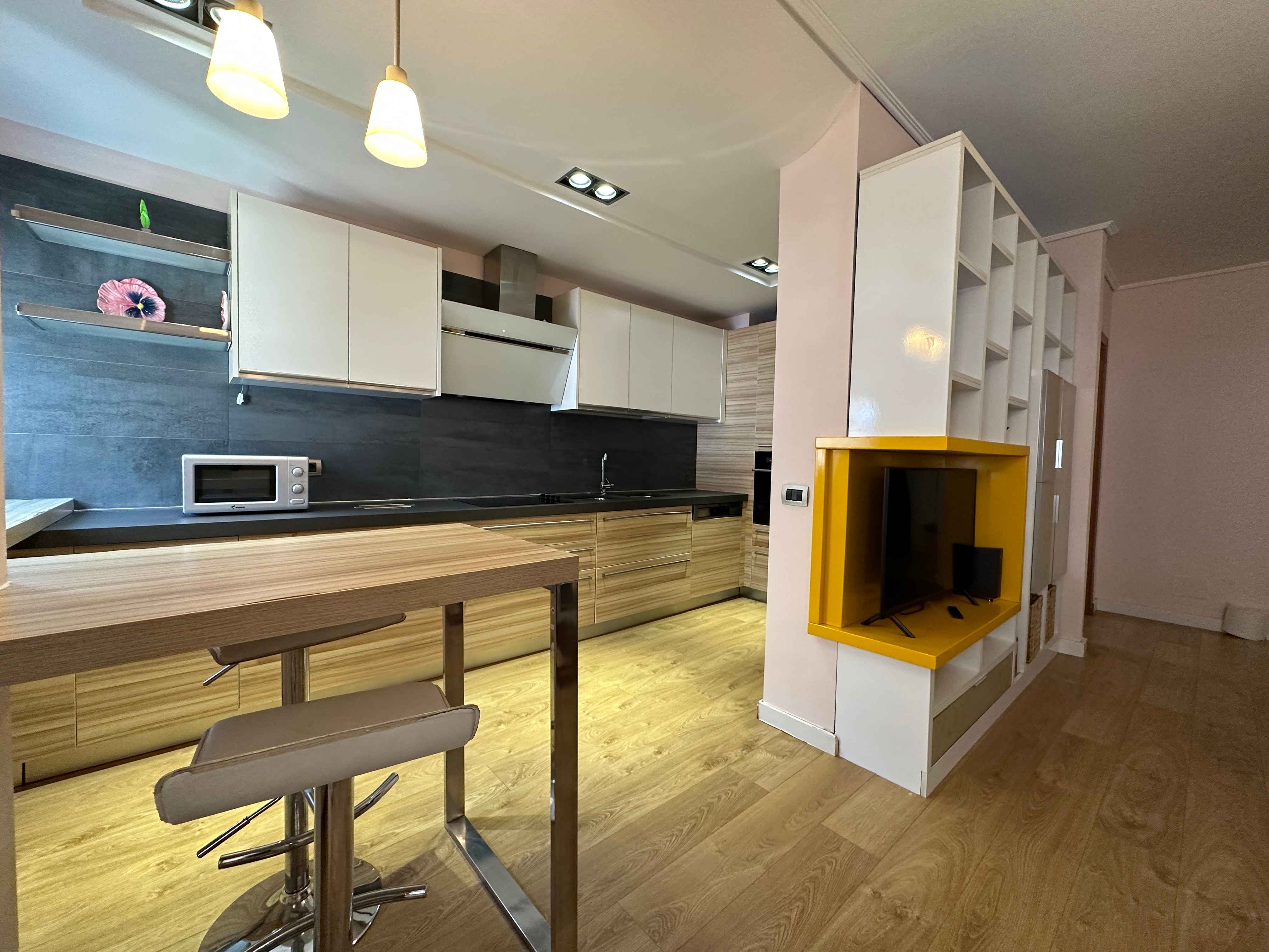 l'appartamento in stile moderno e composto da un ampio ingresso un ampio soggiorno con un comodo divano e tv,una cucina a vista con tutti gli elettrodomestici indispensabili, due camere da letto matrimoniali illuminate da grandi finestre e due bagni moderni con box doccia lavatrice,un lungo balcone con tendone.