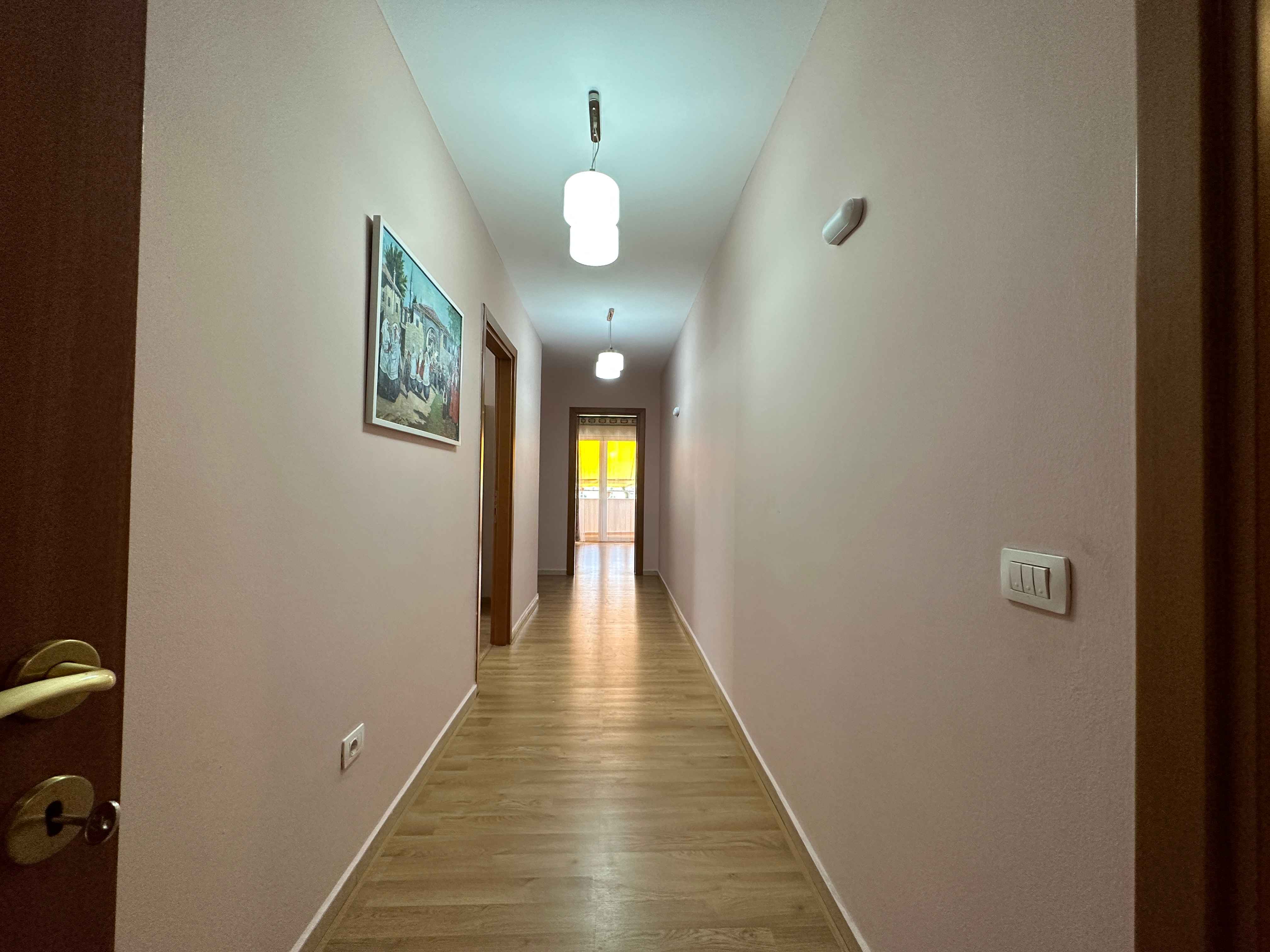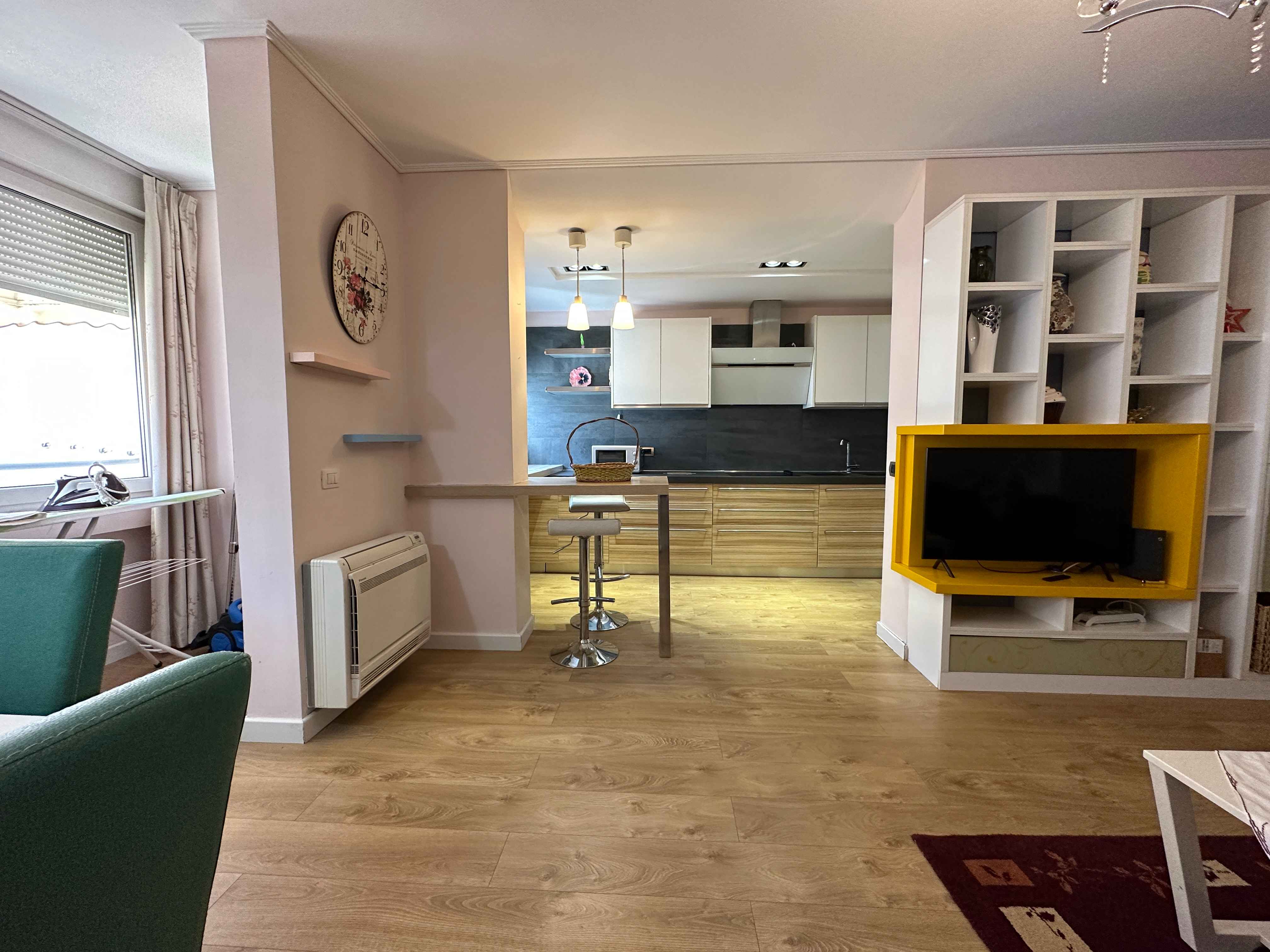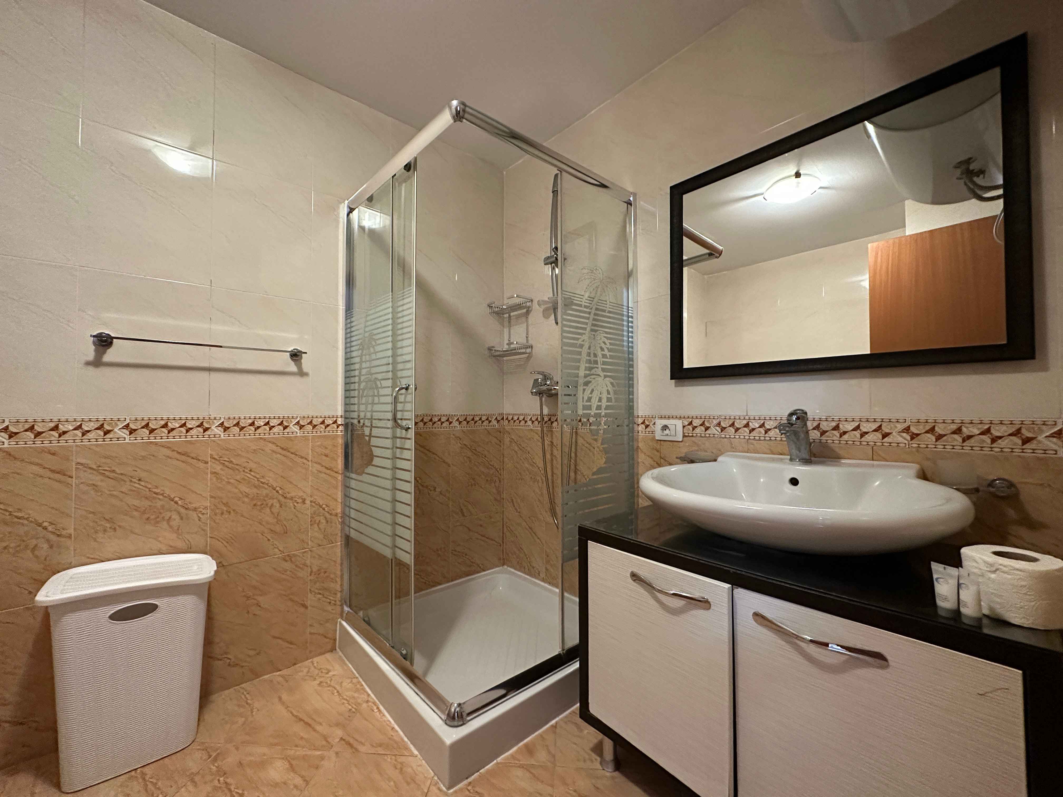 l'appartamento in stile moderno e composto da un ampio ingresso un ampio soggiorno con un comodo divano e tv,una cucina a vista con tutti gli elettrodomestici indispensabili, due camere da letto matrimoniali illuminate da grandi finestre e due bagni moderni con box doccia lavatrice,un lungo balcone con tendone.