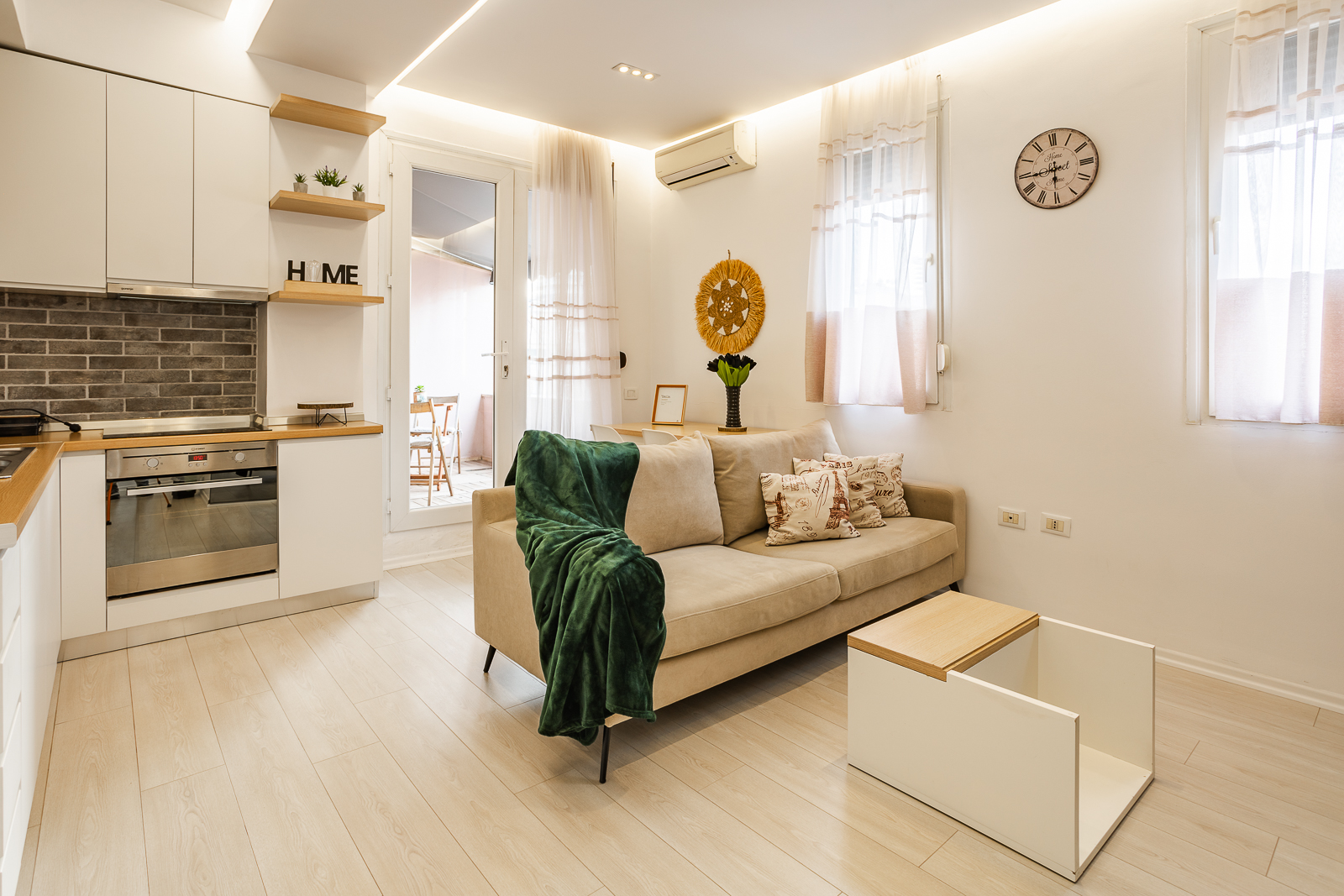 Lo spazio è suddiviso in una camera da letto, un bagno e un soggiorno con angolo cottura e zona pranzo. E la ciliegina sulla torta è il nostro accogliente balcone, dove potrete godervi il panorama sorseggiando un bicchiere di vino :)